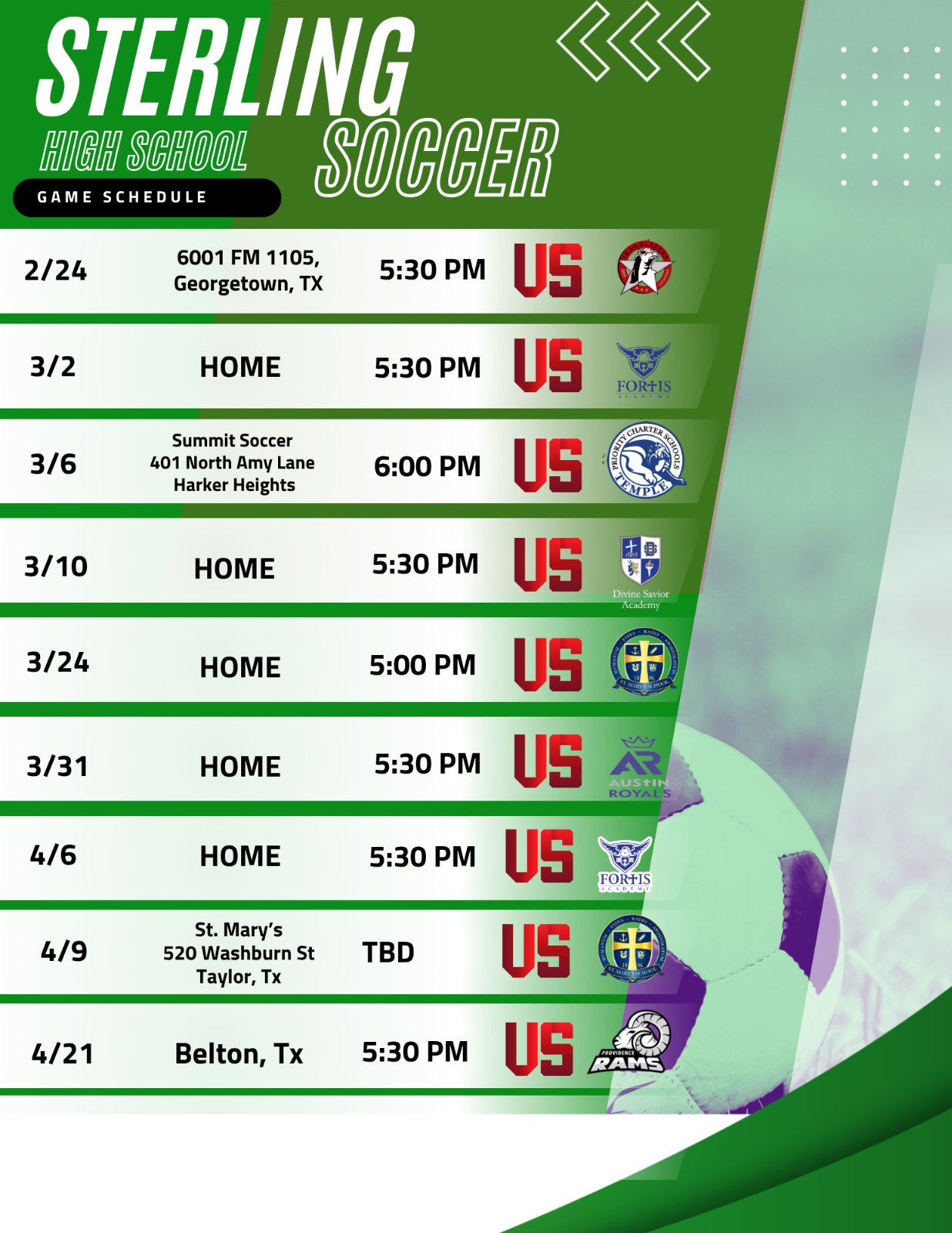Sterling Spring 2026 Soccer Schedule