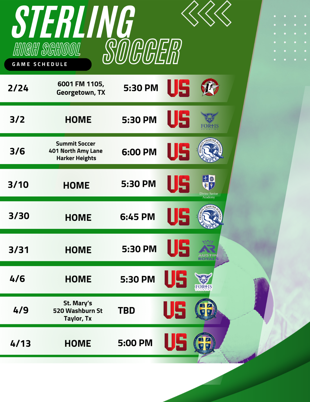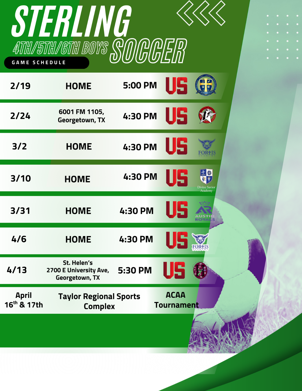 Sterling Spring 2026 Soccer Schedule